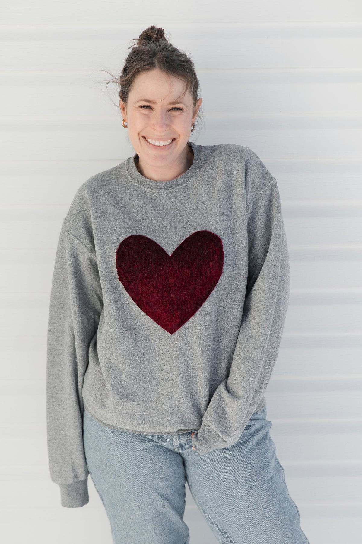 This sweater features a cozy Red Velvet Heart on a Heather Grey Sweater. Each heart is stitched onto a unisex cotton polyester sweater. Carissa is wearing a Medium.