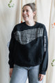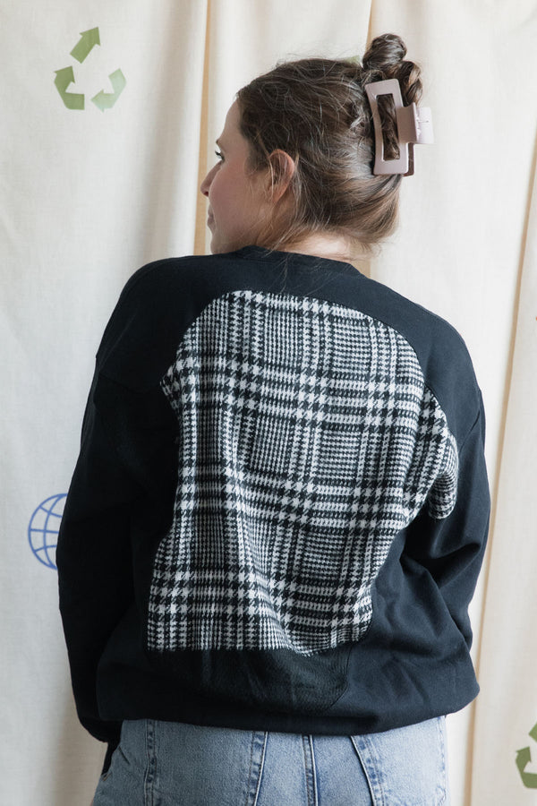 upcycled black crewneck with plaid motif {large}
