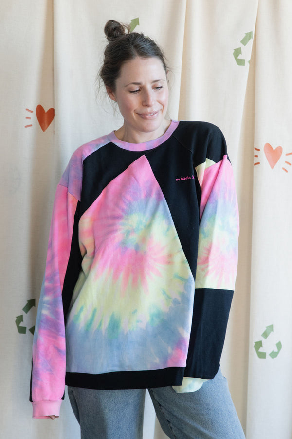another copious 'scrap baby' that is absolute perfection! centred around the stunning beer drinking skeleton, this black and neon tie dyed sweaters is the perfect combo of hippie and grunge.