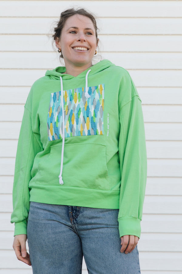 this fun lime hoodie had a logo on the front, and with a little upholstery sample it was given new life!