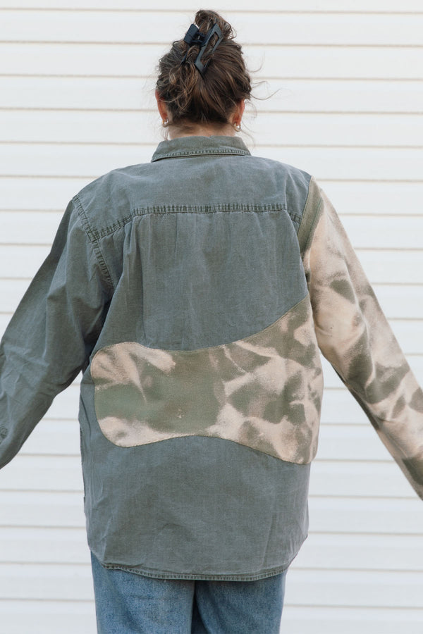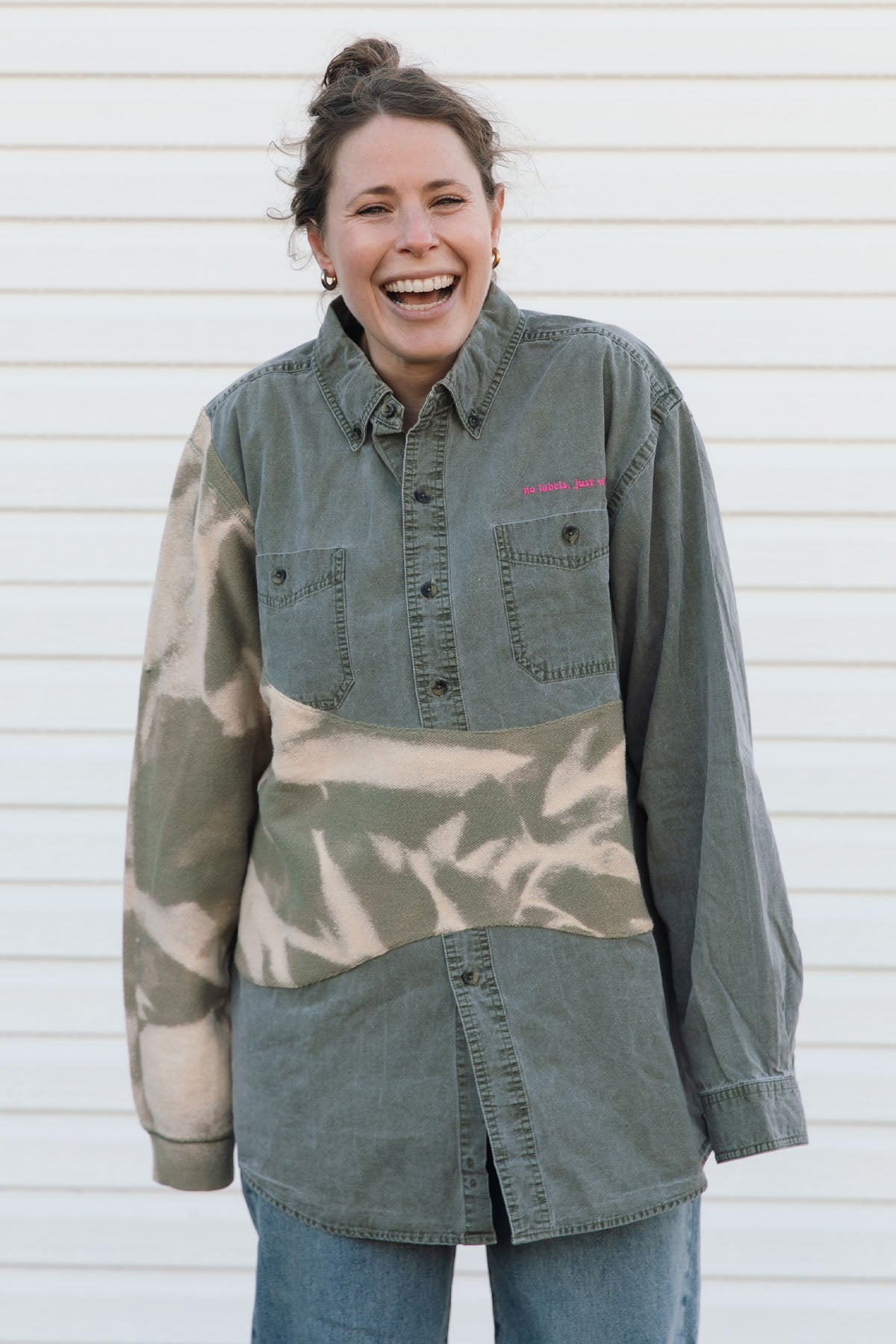 i love mixing pullovers with button ups, it is such a fun and funky way to bring some new life to clothing. This style is extra awesome because this pullover had some stains, and using my favourite bleaching method, I got this gorgeous tiger stripe. With the bleach and the button up mash up, a truly unique pullover was made!