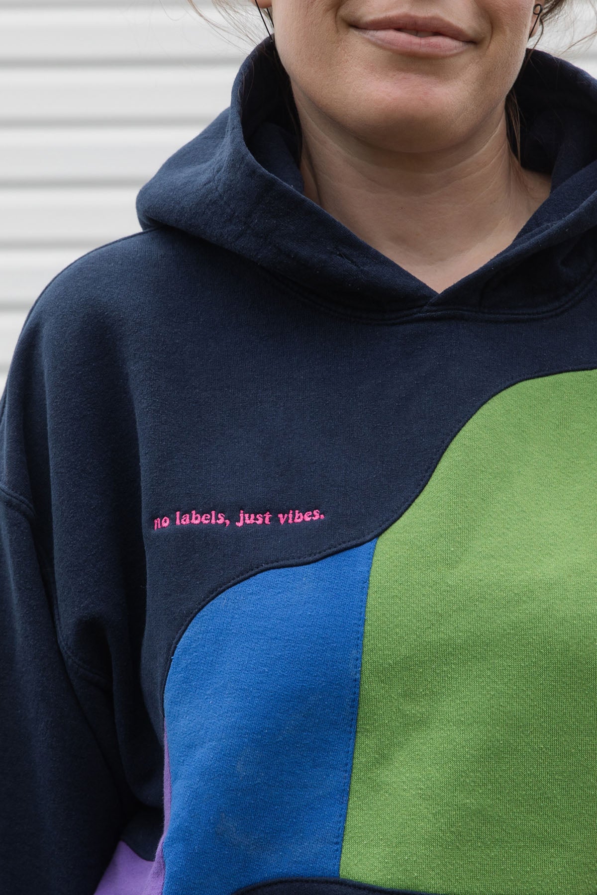 this was a classic high-school sports team hoodie, but we all grow up so this hoodie had to too. Covering up all unwanted logos with a rainbow felt so special. It was so much fun to sort through my scrap bin and find all the right colours and lay out this super special hoodie!