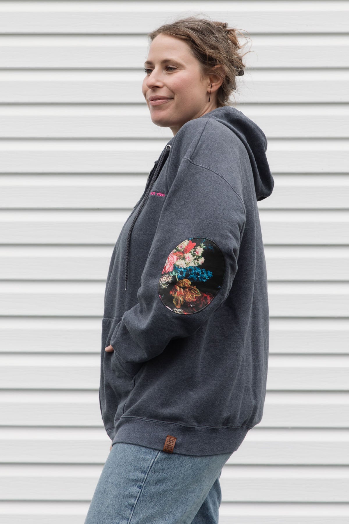 upcycled grey zip up hoodie with floral elbow patches {x-large}