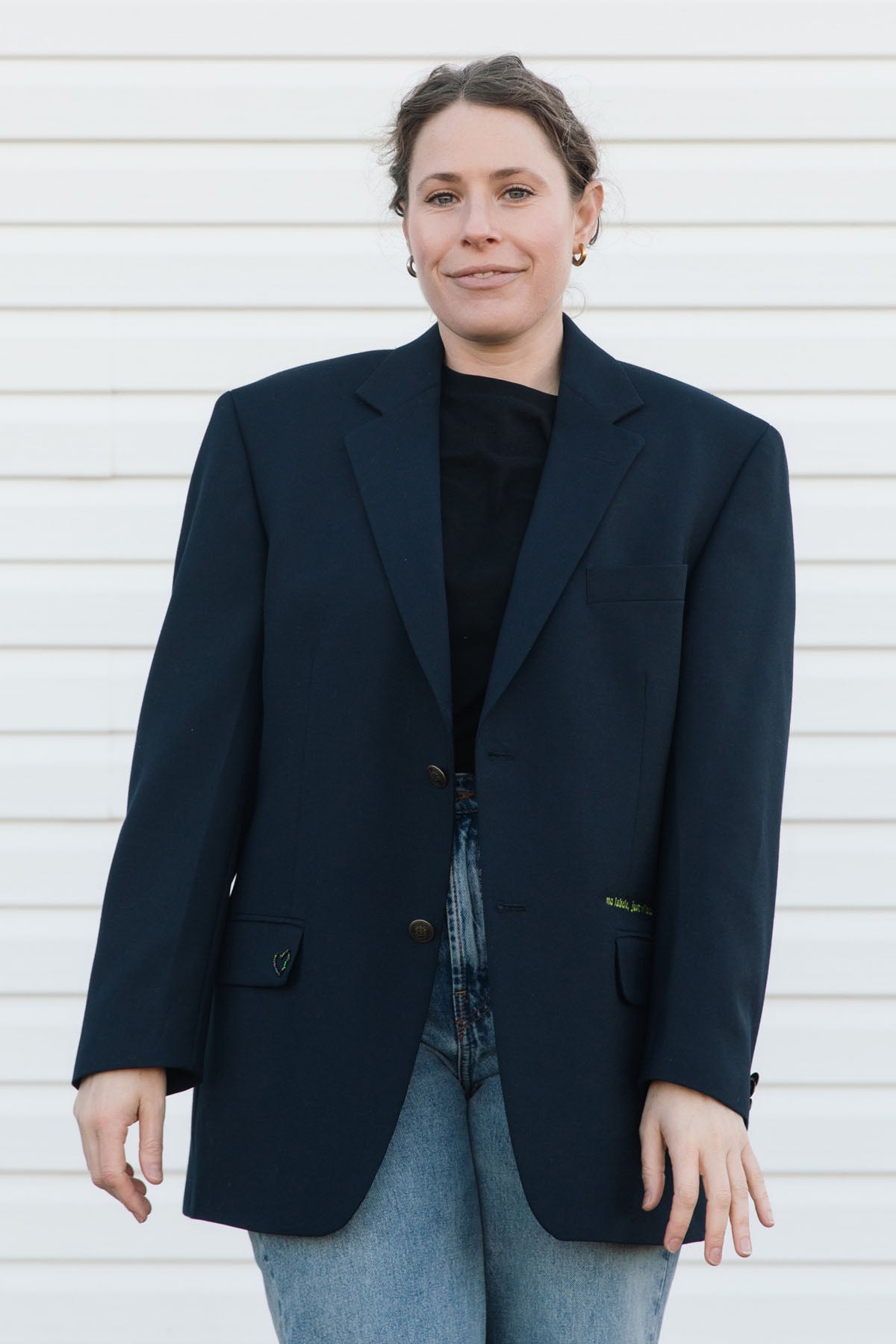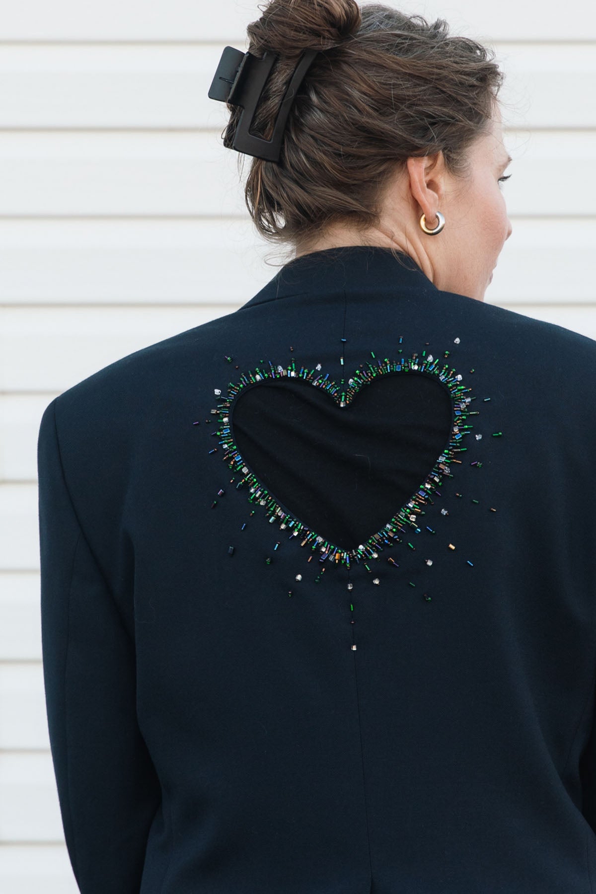 this standard navy blazer needed a major refresh. As soon as I saw this colour I knew I wanted to use my navy, iridescent and green beads to pump up the chic volume. First I created a heart cut out in the back and then used beads to enhance the heart cut, and make sure eyes will always be looking at this statement piece. On top of the dramatic heart in the back, there is a tiny beaded heart on the front too! I can see this dressed up or thrown on over a comfy sweater to head to brunch. No matter where you take this piece you will always be catching eyes.
