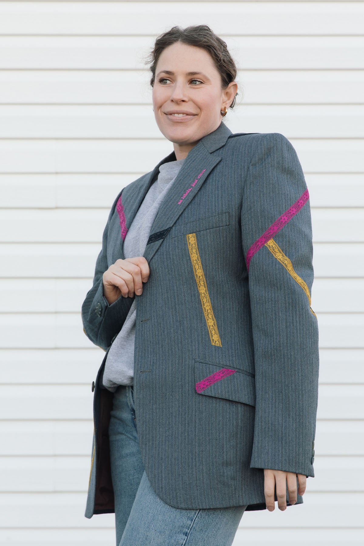 this classic blazer needed a little colour added to it. with the beautiful pink, yellow and navy ribbon delicately placed throughout the blazer it takes a traditional piece and brings a touch of whimsy & fun!