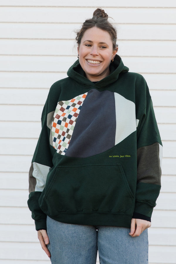 this sweater had an unwanted sports logo, i removed it and used fun scrap fabric to give this classic green hoodie new life.