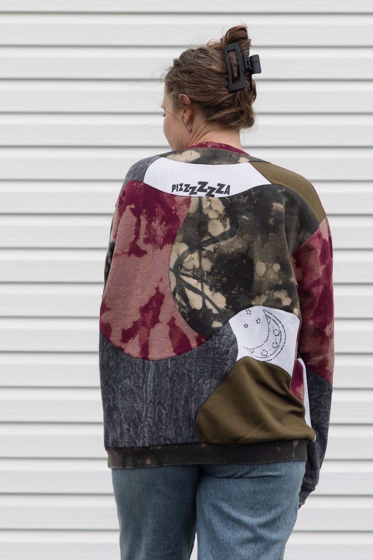 another copious 'scrap baby' that is absolute perfection! this one is a little grungy, a little punk rock and a lot of style. It features a blend of bleached sweaters, all to centre around the piece de resistance, the PIZZA logo on the back!