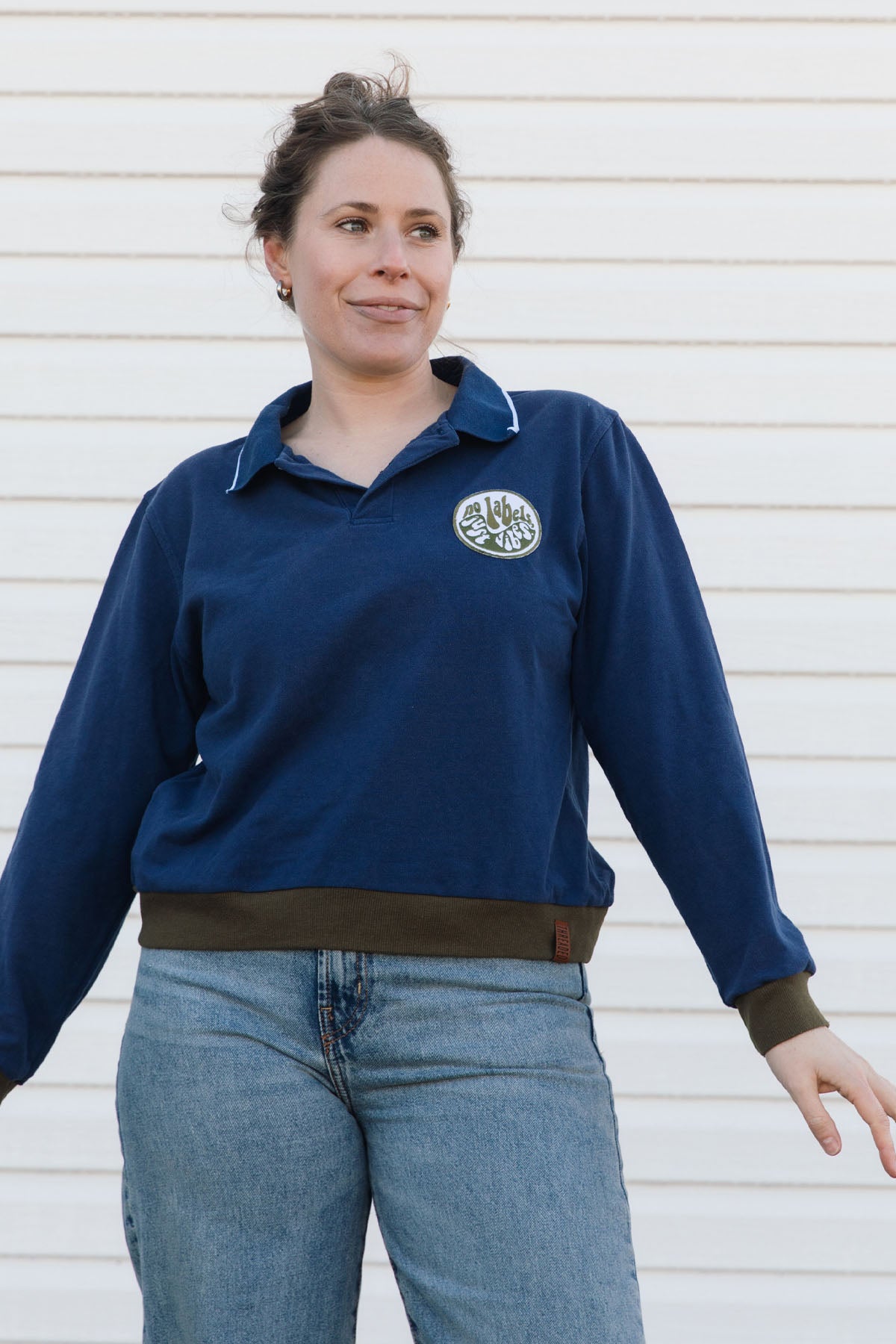 this collared shirt really just needed a refresh! cropping it and adding in some green cuffs at the hem and of course the classic 'no labels, just vibes.' patch! Now it has a little more style.