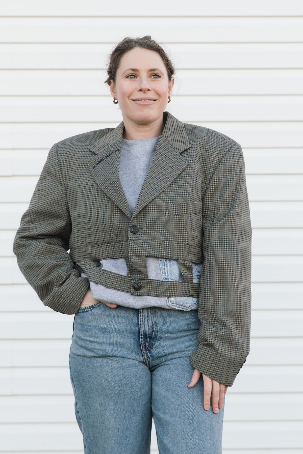 this blazer was a little, well boring, stuffy, too traditional. with this upcycled design, none of those words can be used again. featuring a cropped style, and a caged detail around the waist this blazer is now fun, fashionable & bold!