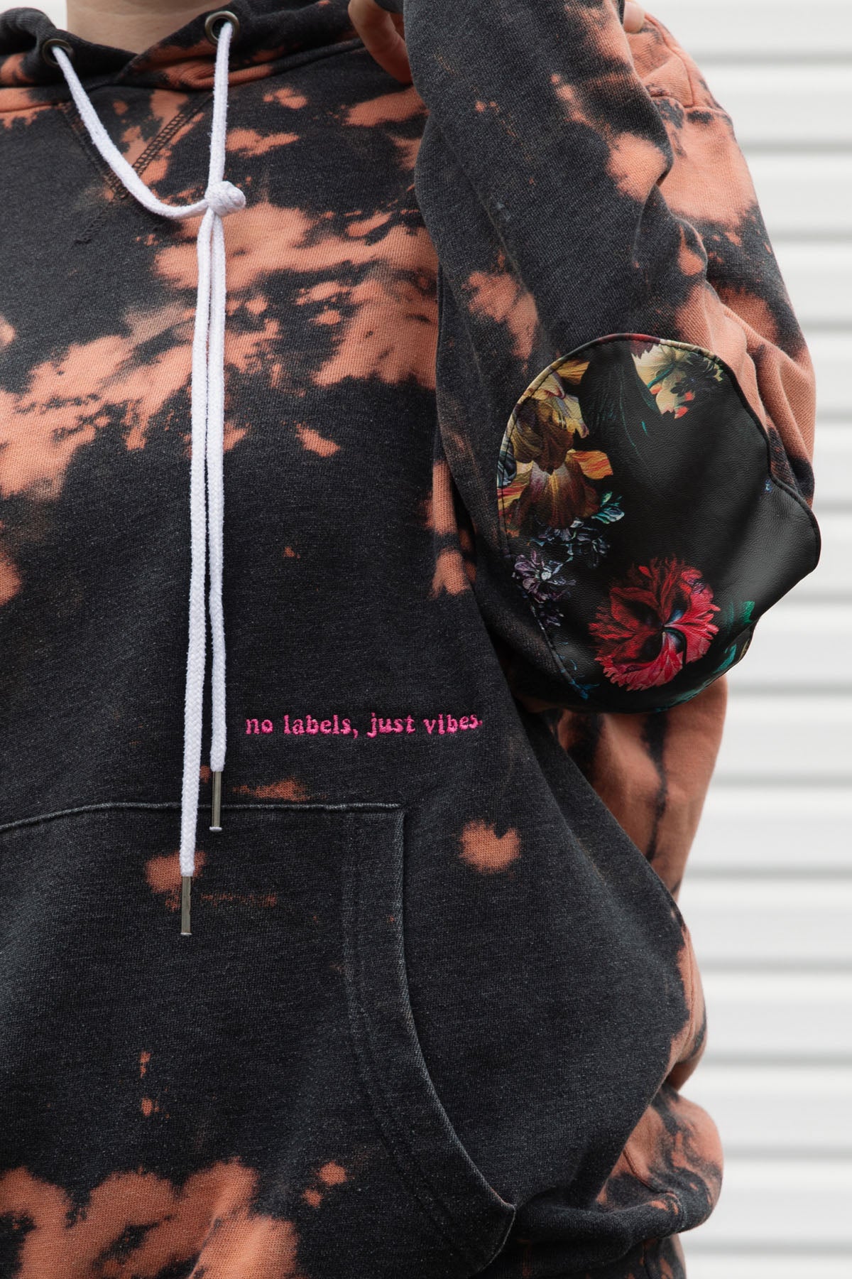 this sweater had been loved, and the stains showed it. I love taking sweaters like this and giving them new life. It is better than ever, a little funky plus with the added elbow patches it has a fun little floral moment.