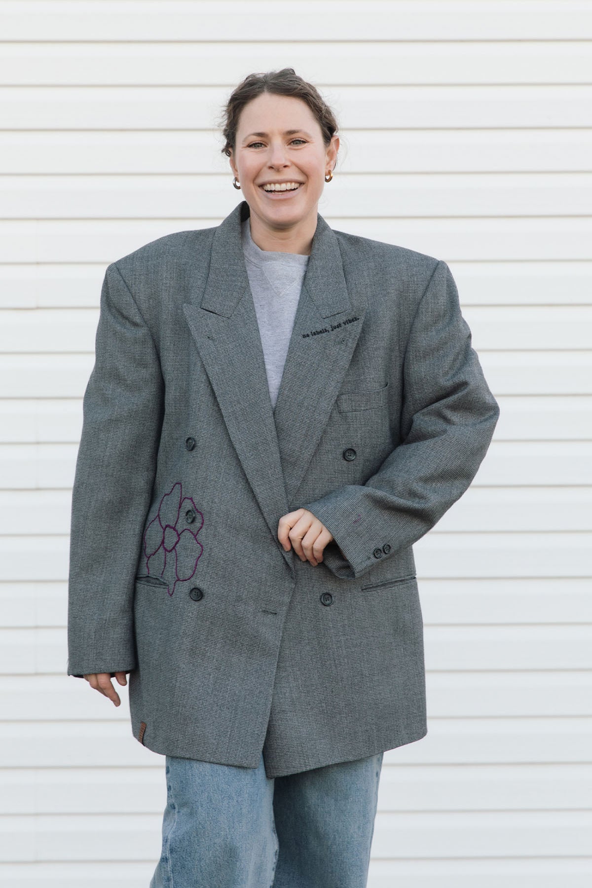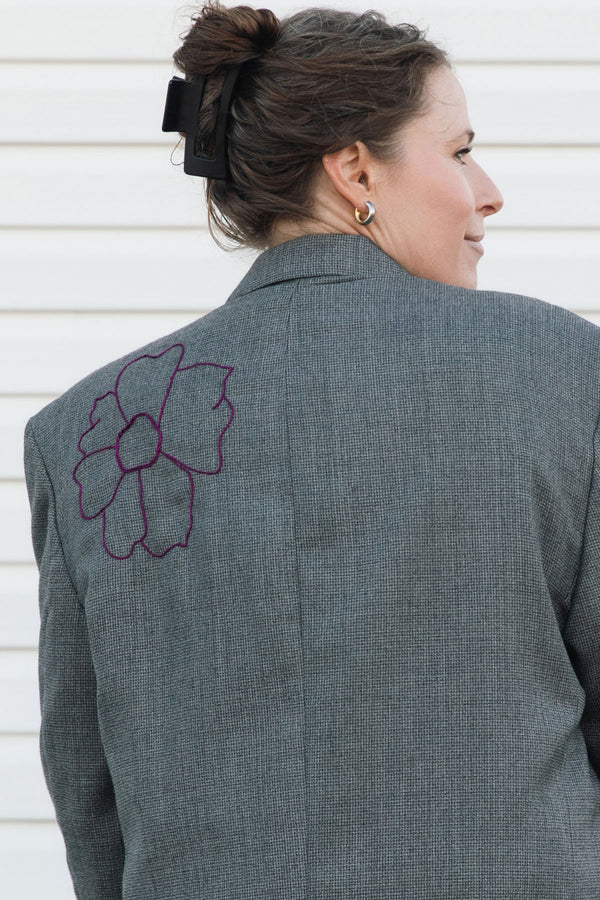 this classic blazer needed a little design and colour added to it. With a beautiful purple peony hand embroidery on the front and back sets this double breasted blazer apart of the rest.