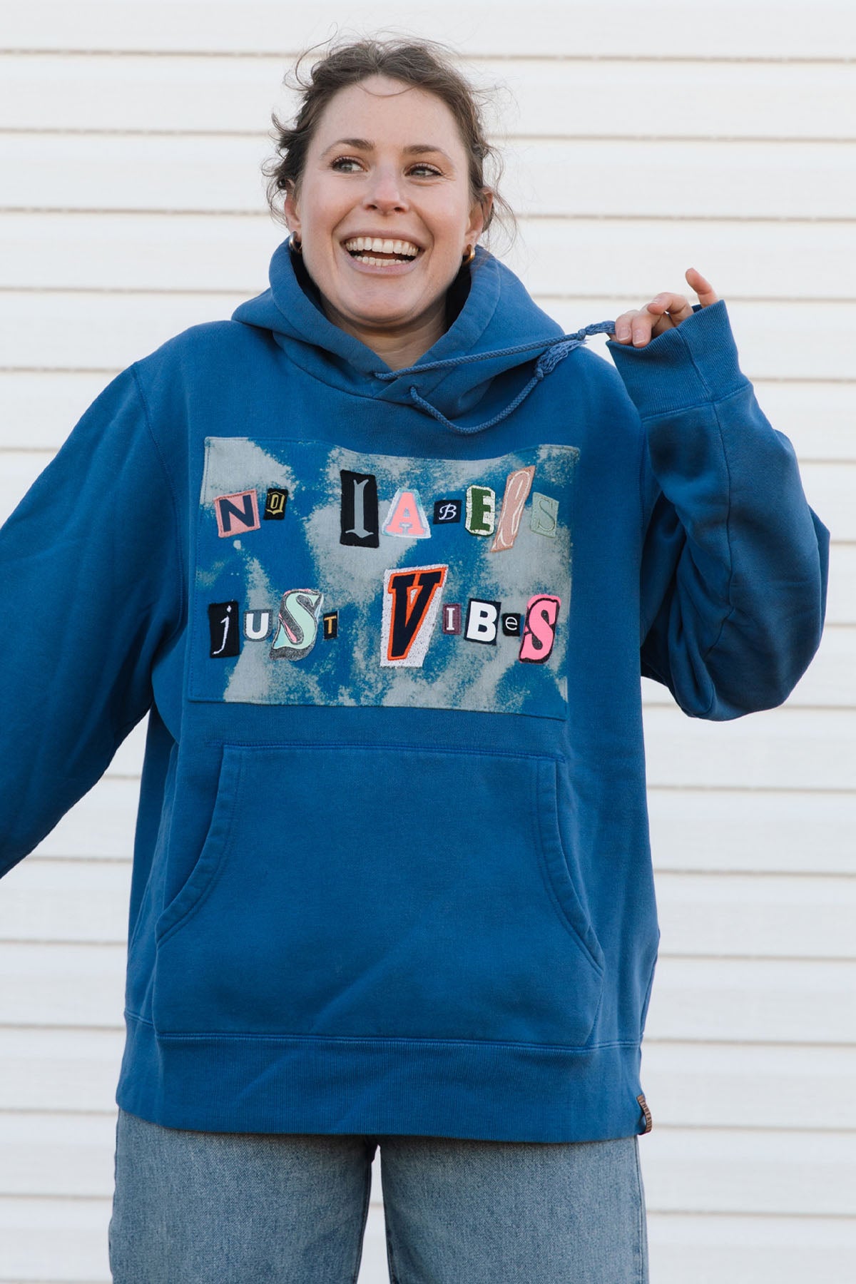 this sweater needed some charactered added to it. What is better than the THREADED logo displayed with letters saved from unwanted logos, what a full circle moment for this upcycled sweater.