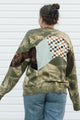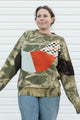 this sweater was stained all over + had a logo, which means it needs a major upcycle! bleached & squiggly line patchwork fabric brings this sweater new life, and honestly makes it WAY more fun!