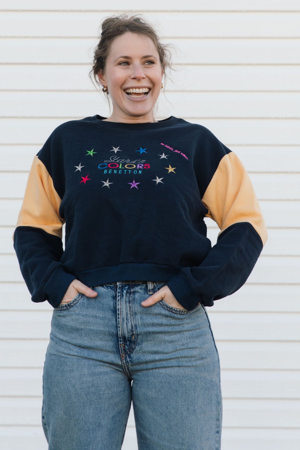 this Colors of Benetton sweater is 100% cotton which is super rare! i love when i find sweaters from a gone by time, it just needed some redesign. It was very tight at the hips and the sleeves were short, after some upcycling she is good as new!