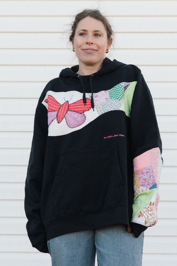 this classic sporty hoodie, was just that a 'sports' hoodie with branding everywhere. By using quilting scraps I was able to remove all unwanted branding and bring to life a truly one-of-a-kind design.
