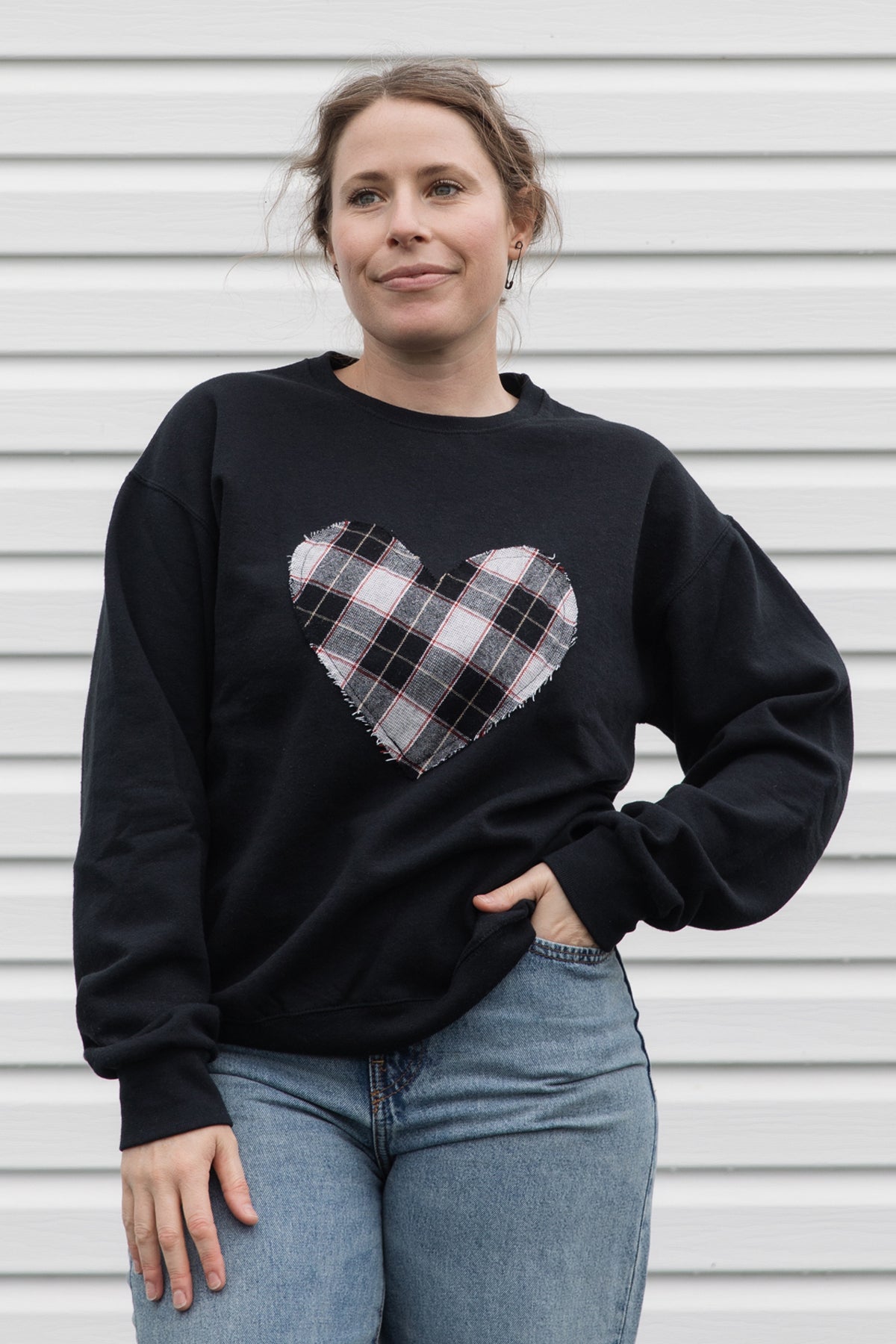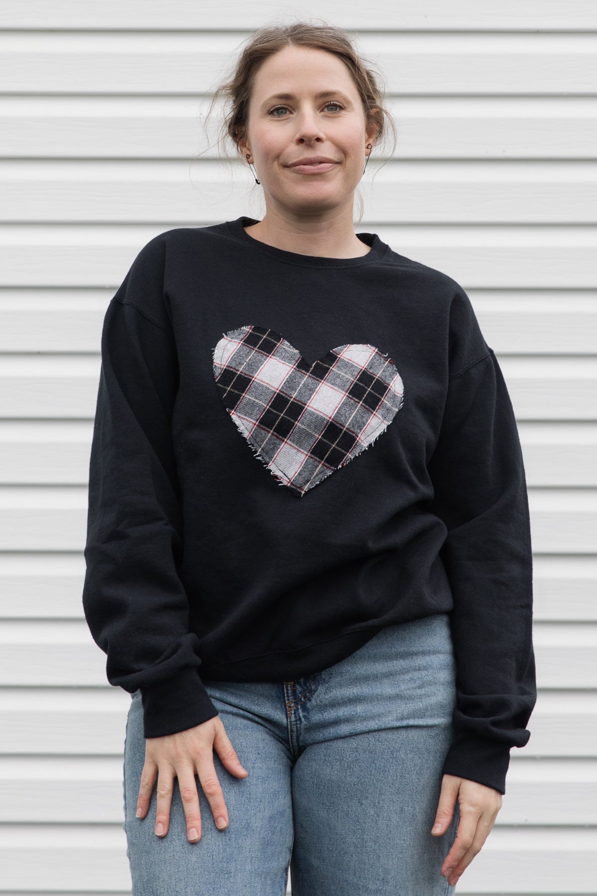 This sweater features a chic Black & White Plaid on a Black Sweater. Each heart is stitched onto a unisex cotton polyester sweater. Carissa is wearing a Medium in 1st image, and a Small in image 3.